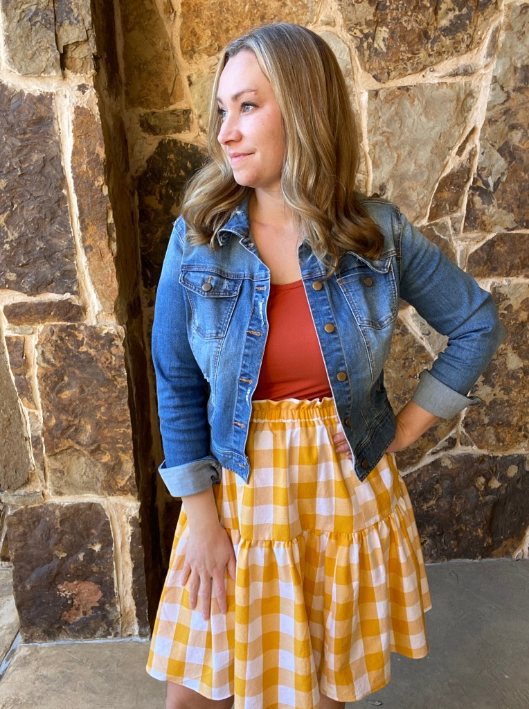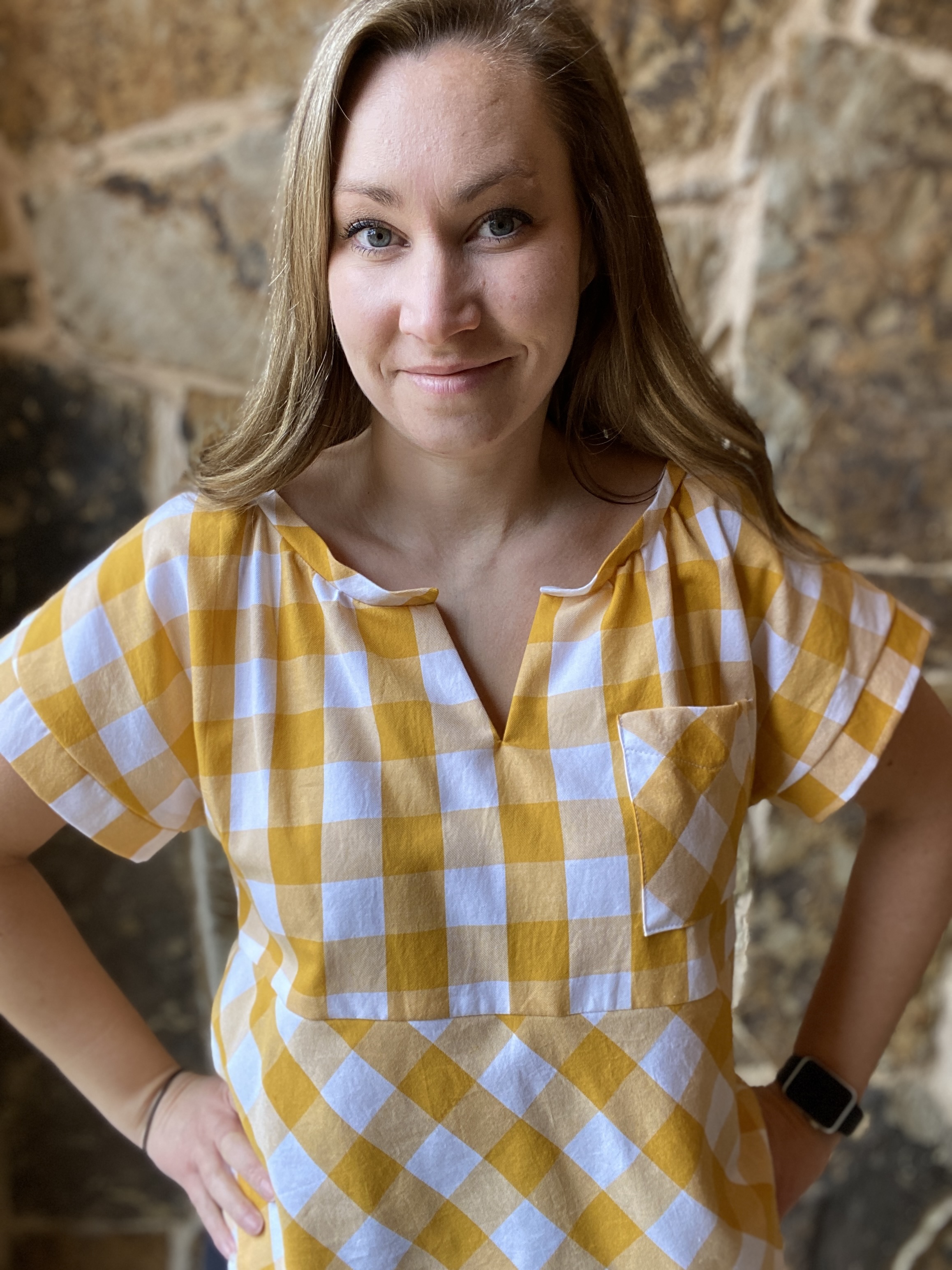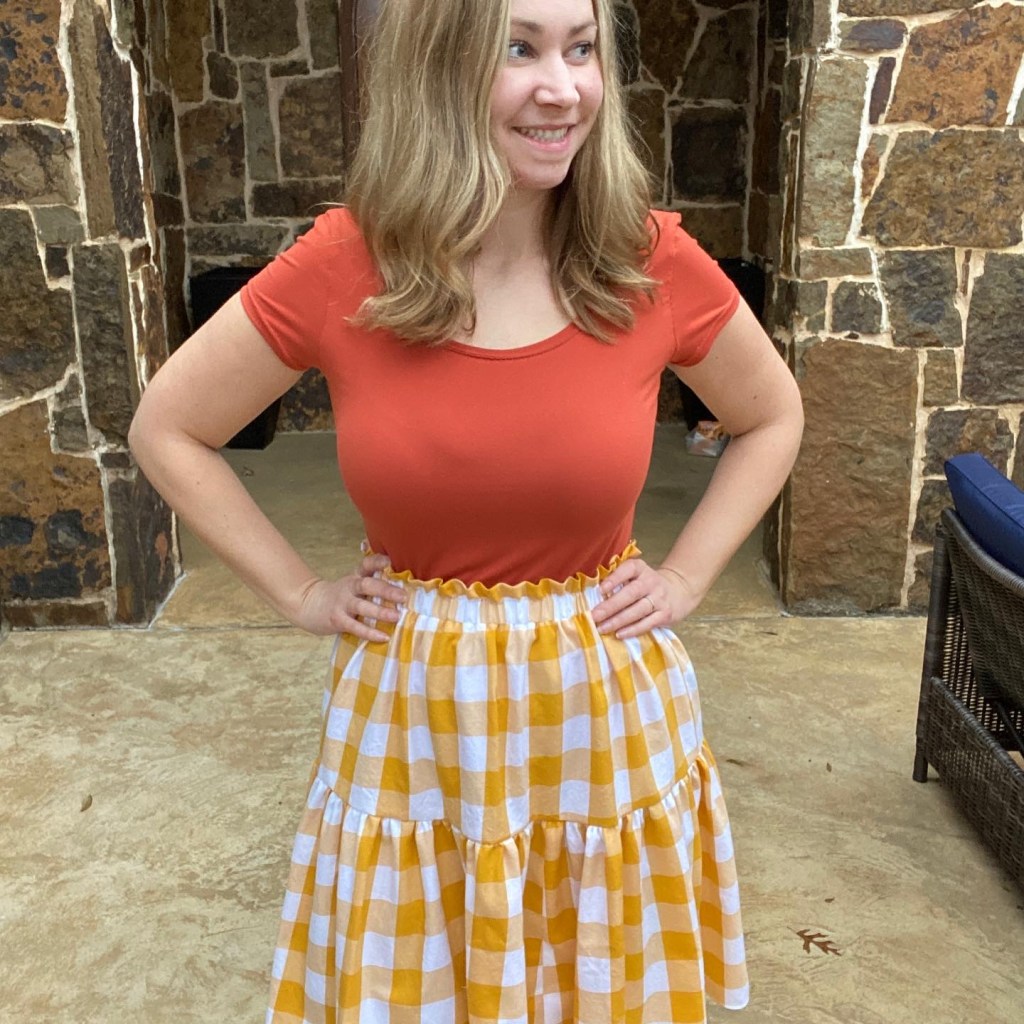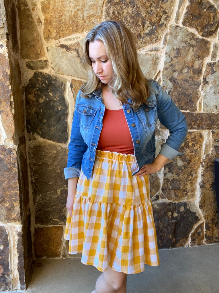 I’ve recently wandered back into the sewing room and began working on my piles of fabrics. I made an orange Stasia Tee the other day and once I saw it with a yellow gingham remnant I had, I started to feel inspired to create another capsule wardrobe.