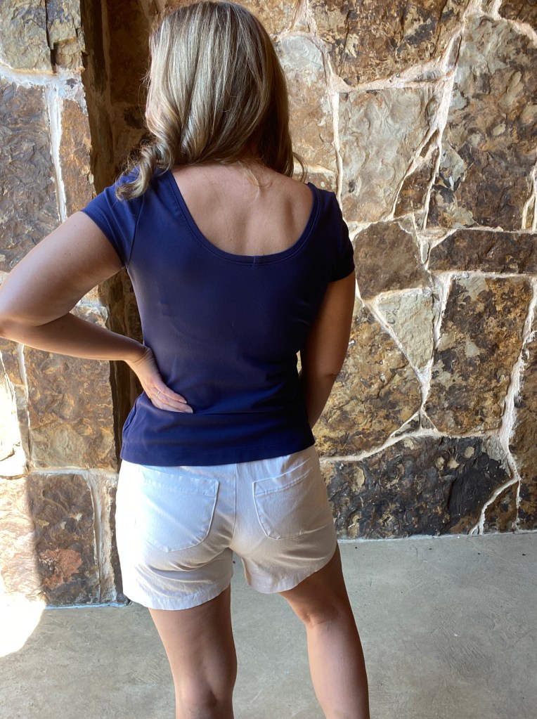 I used McCall’s M8118 again and made a second pair of navy, linen shorts from the remnants from the Pietra shorts.