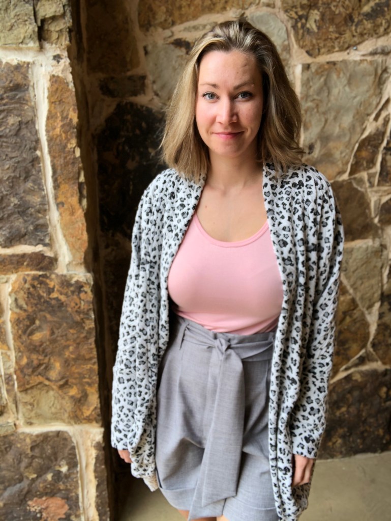 - Green and white striped cardigan is the Helen’s Closet Blackwood Cardigan