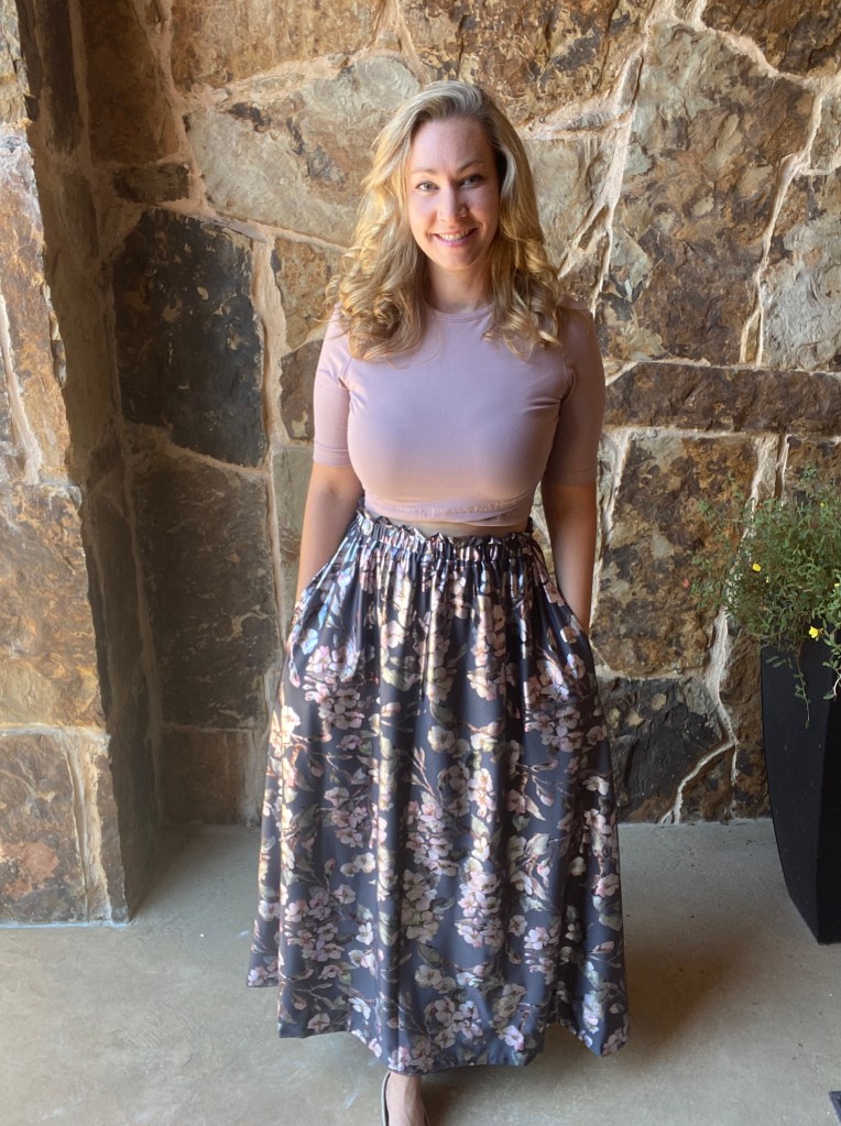 I really like how it fits through the waist and hips but I didn’t love that it doesn’t have pockets. There isn’t a great way to add pockets because the first tier ends where the pockets would go and the next tier’s seams aren’t along the sides.