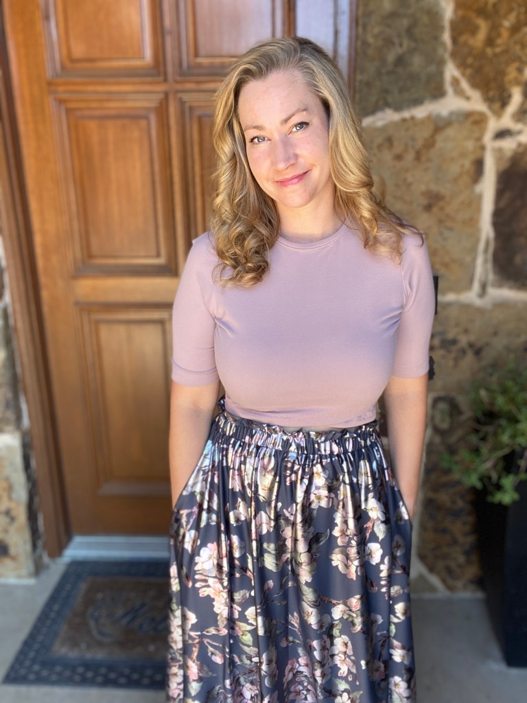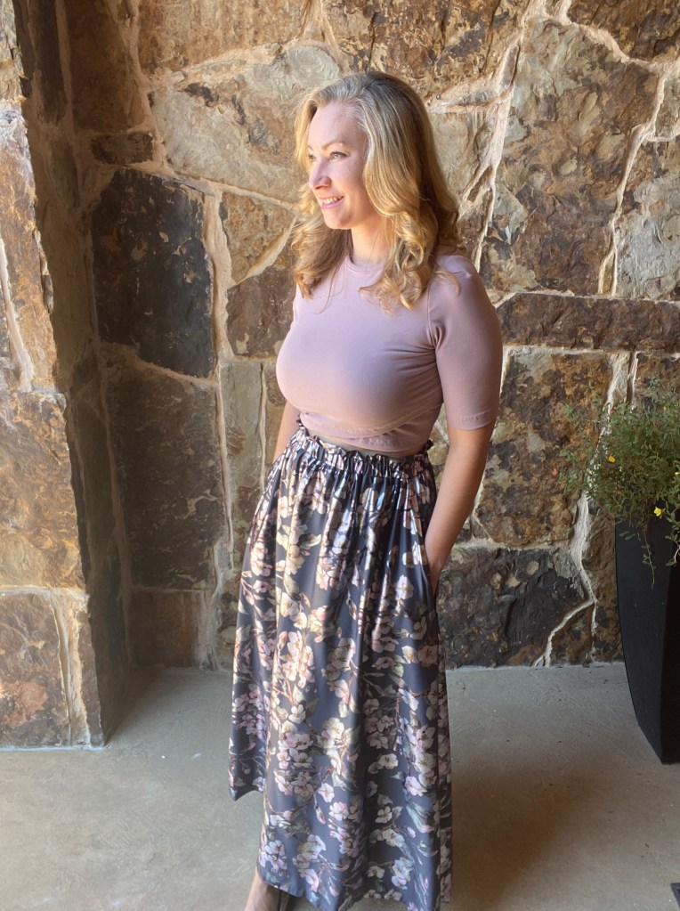 The fabric for this skirt was on the clearance table at Joann Fabrics and when I saw it I knew it needed to be a skirt for date night and I knew I had some knits that would match it. Many of my fabrics have been hanging out in my stash for anywhere from a year to even four years but this one never even made it to the closet. It was immediately transformed.