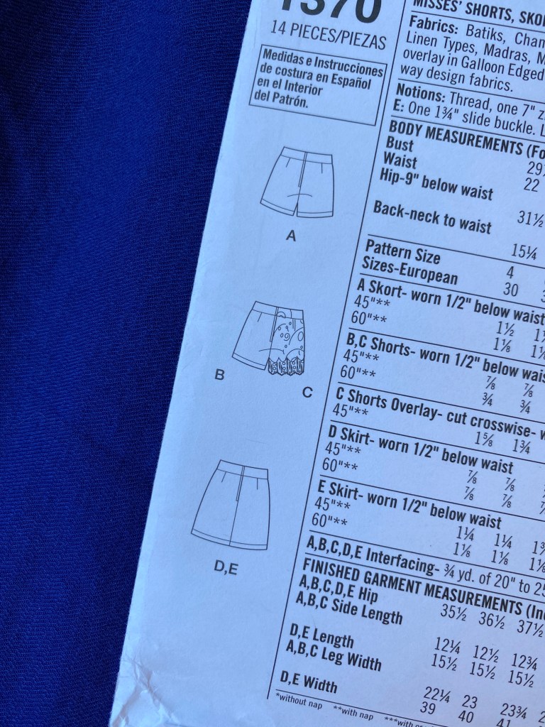 Upon reflection I did realize that I needed to challenge myself to try something new. I opted to try Simplicity 1370. It’s a short skirt/shorts pattern but I liked the fitted nature at the top and thought that it might work well with this.