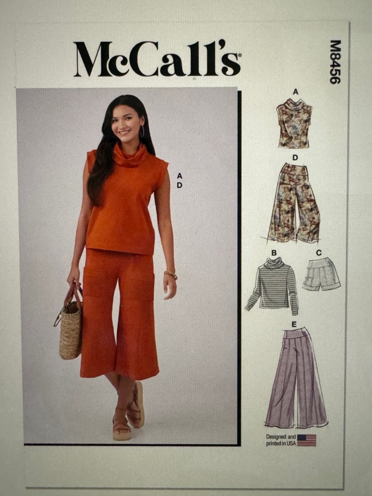 I’ve made two versions of M8456 and made zero alterations. I made size 14 and didn’t have enough for any more than a half inch hem. I wasn’t a huge fan of the pants until I used the coverstitch to sew down the seam connecting the waist band to the legs of the pants. Overall this is a fast, easy sew and the pants are very comfortable.